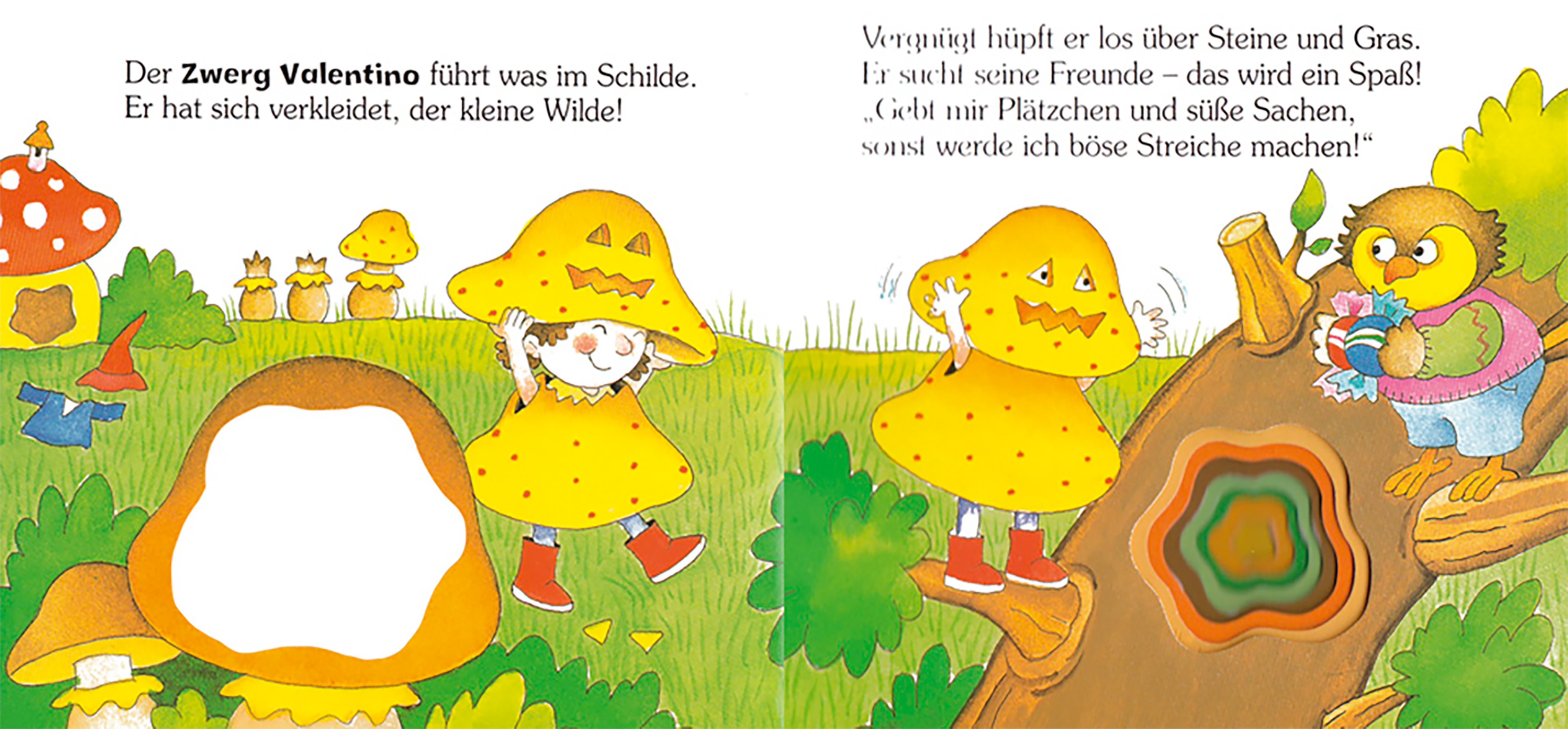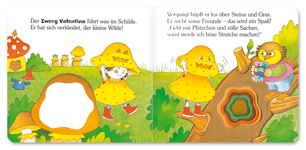 Der Zwerg Valentino geht um und räubert Süßigkeiten. Schließlich ist sein Säckchen so voll, dass ihm ein Missgeschick passiert. Farbenfrohes Büchlein für die Allerkleinsten aus stabiler Pappe mit Reimen. Zum Entdecken und Begreifen.