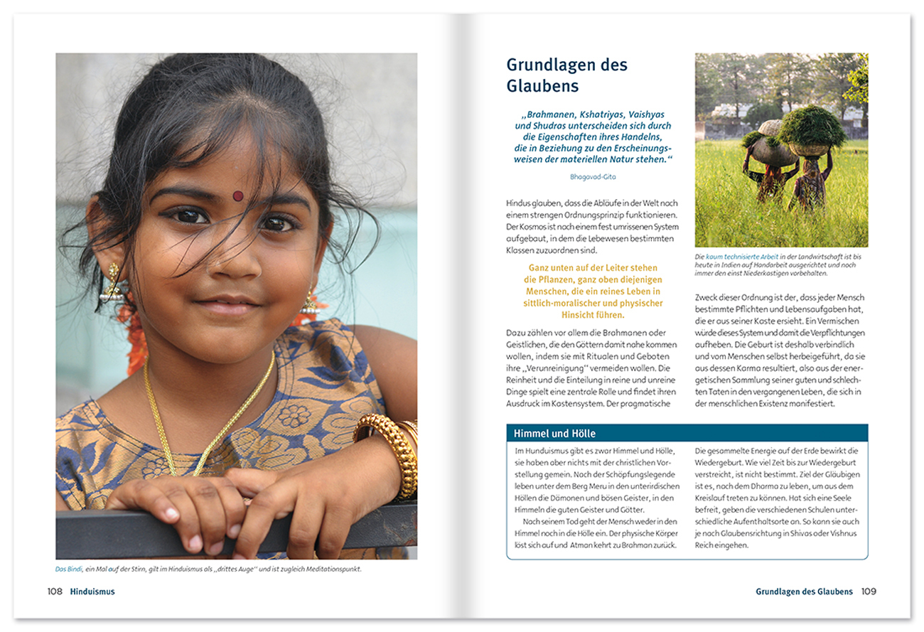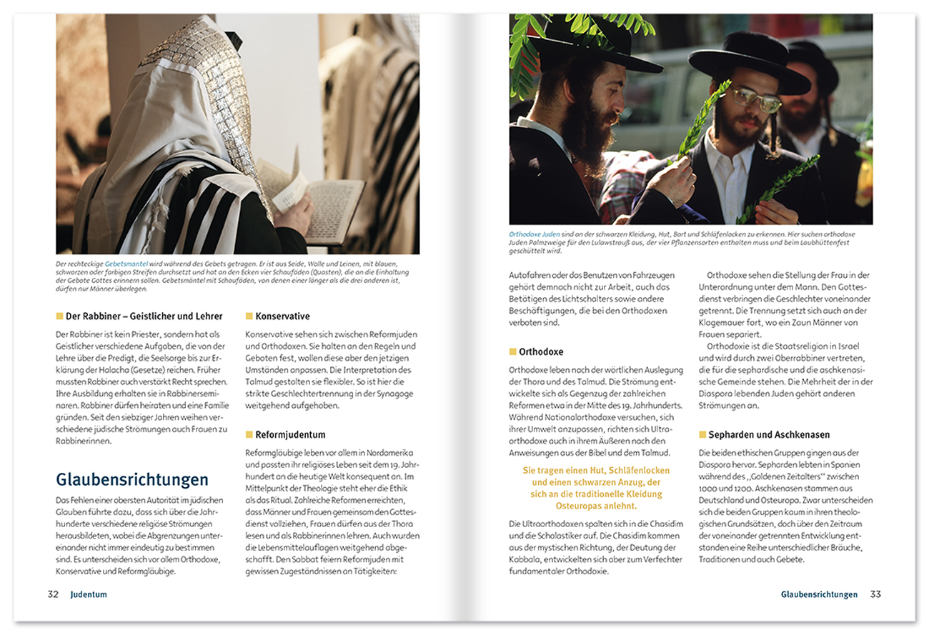 Schon immer suchen die Menschen nach dem Sinn des Lebens - in der Religion finden die meisten eine Antwort. So bekennen sich heute drei Viertel der Weltbevölkerung zu einer der großen Glaubenslehren: Judentum, Christentum, Islam, Hinduismus, Buddhismus, Konfuzianismus und Daoismus. Dieses Nachschlagewerk erläutert die Grundzüge der Glaubensrichtungen, die geschichtliche Entwicklung sowie die jeweiligen Götter, Schriften und Zeremonien. Mehr als 200 Abbildungen sowie zahlreiche Zeittafeln und Karten veranschaulichen die wesentlichen Inhalte der Religionen.