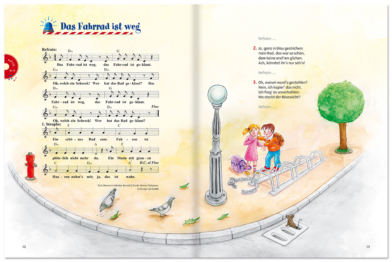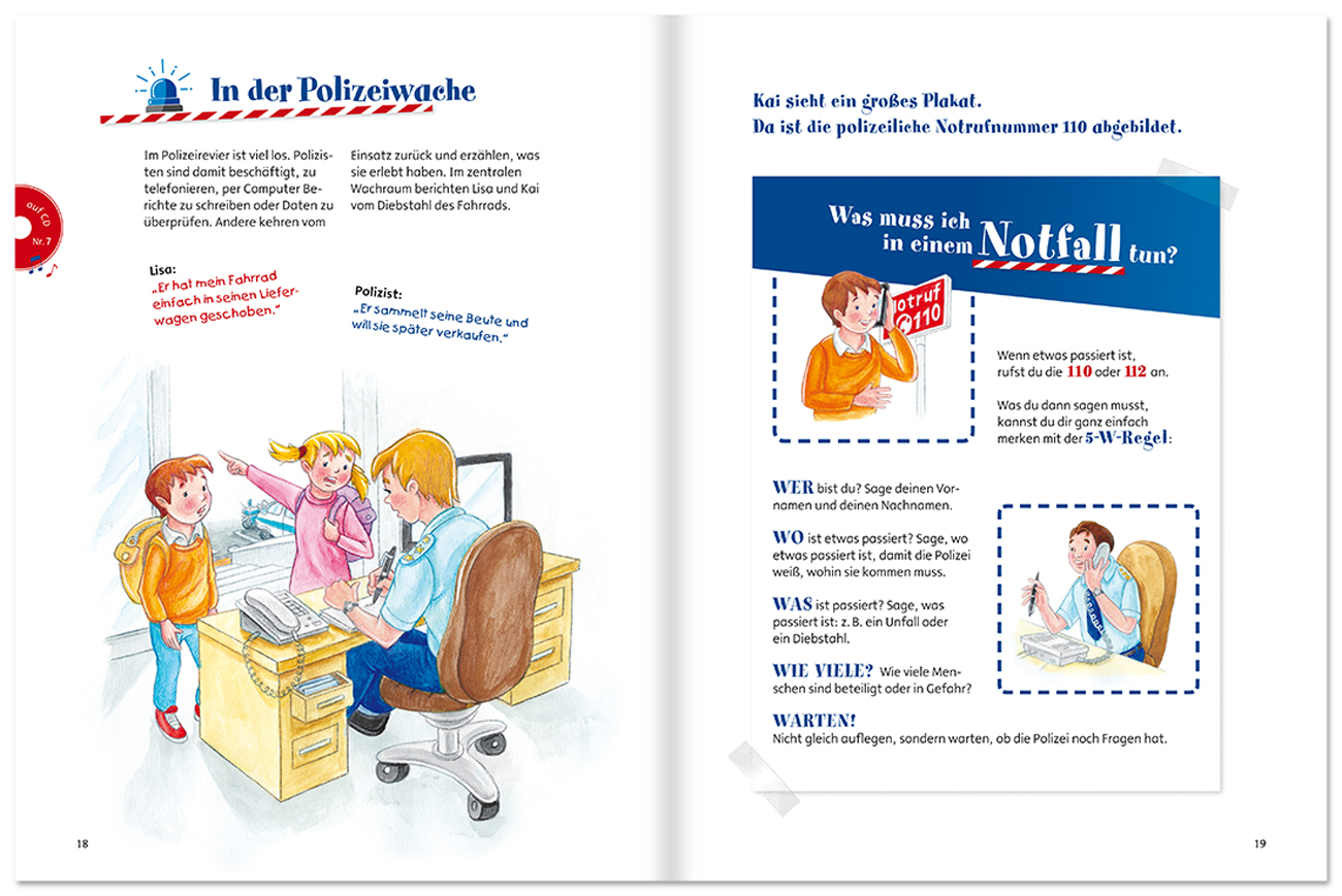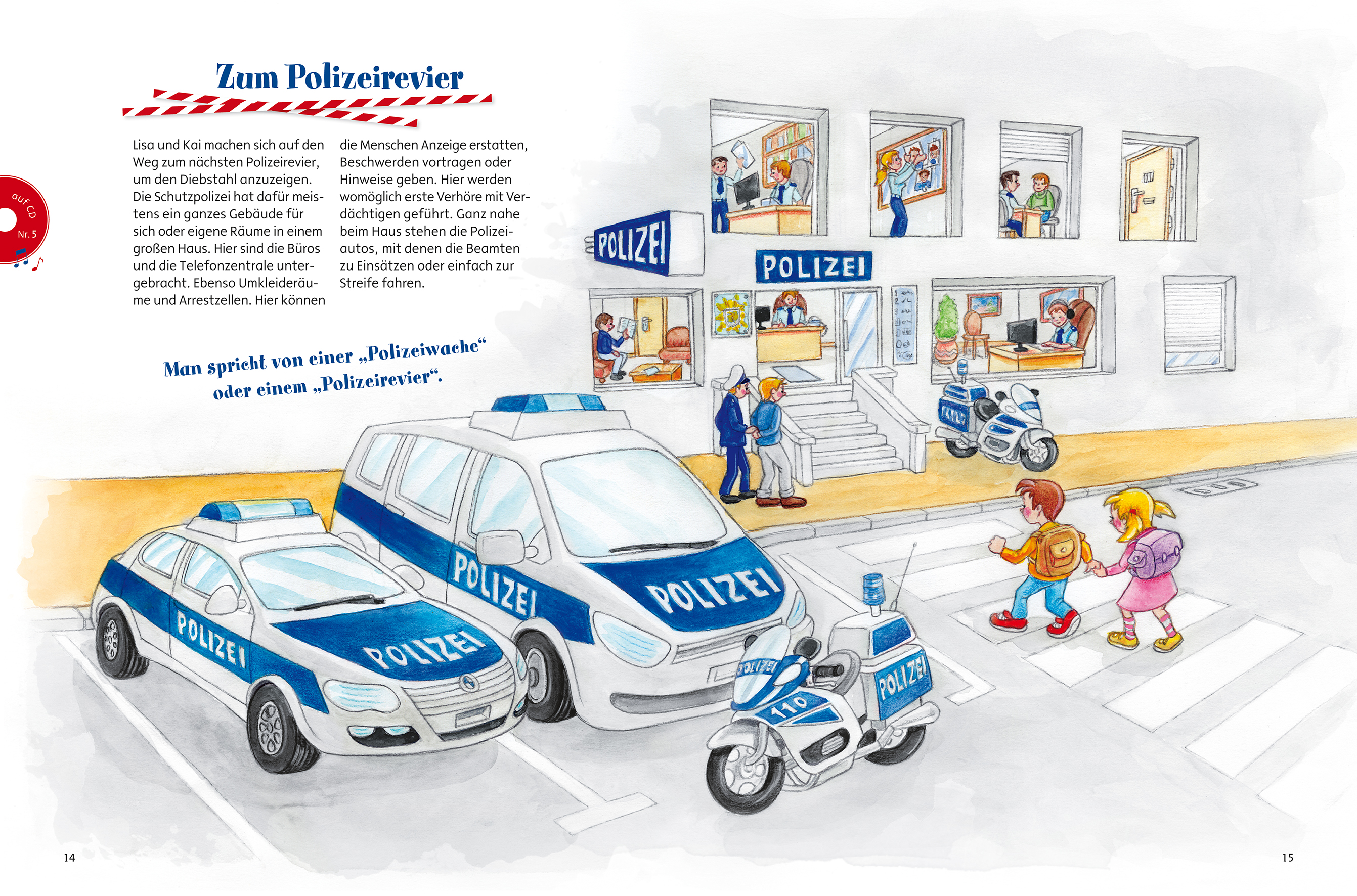 Auf der Polizeiwache ist immer was los: Hier gehen Notrufe ein, werden Anzeigen aufgenommen und Einsätze gestartet. Lisa und Kai melden einen Fahrraddiebstahl und erleben dabei den spannenden Alltag der Polizistinnen und Polizisten. Die fröhlichen Lieder runden die Geschichte musikalisch ab und sind auf der beiliegenden CD vertont.